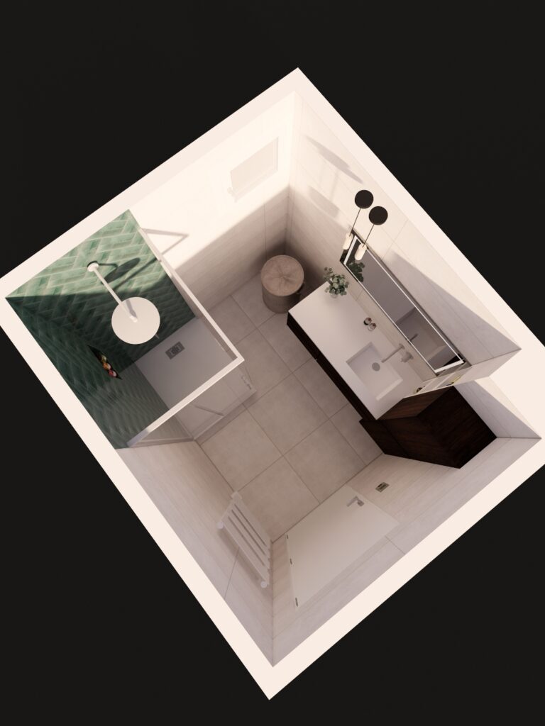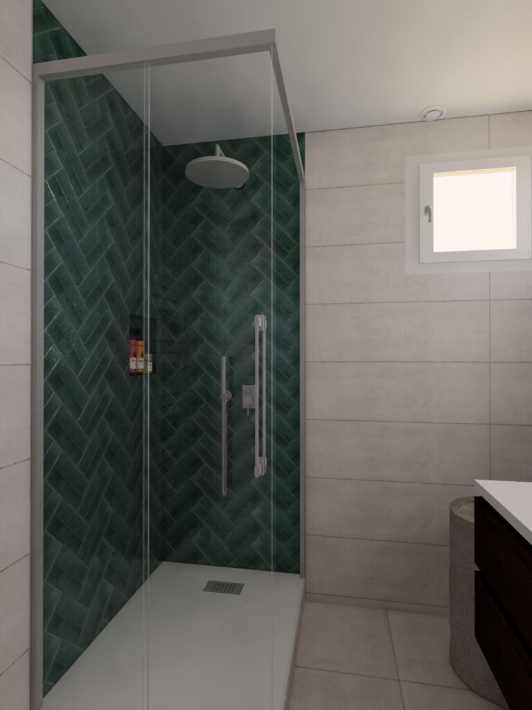 Les volumes ont été entièrement repensés afin de créer une douche généreuse, habillée de zelliges couleur émeraude qui apportent caractère, profondeur et une touche raffinée à l’ensemble.