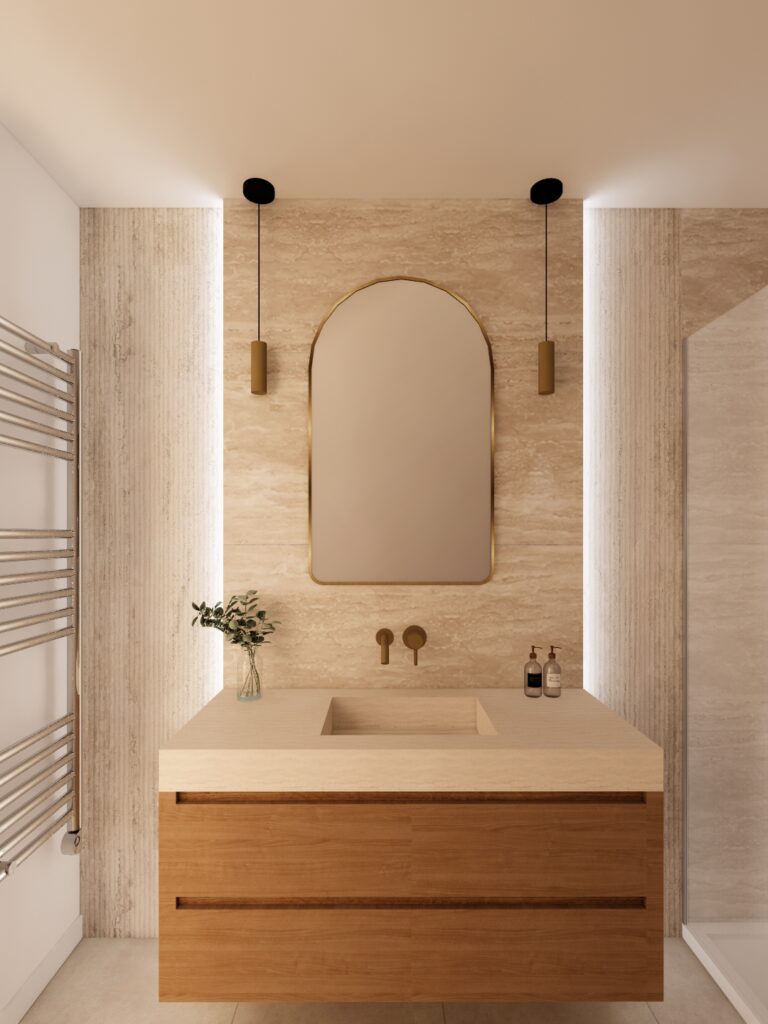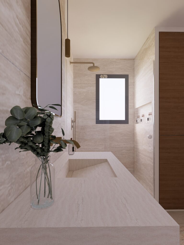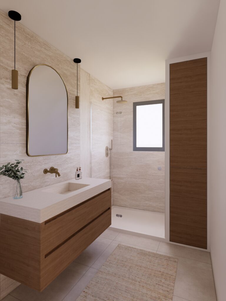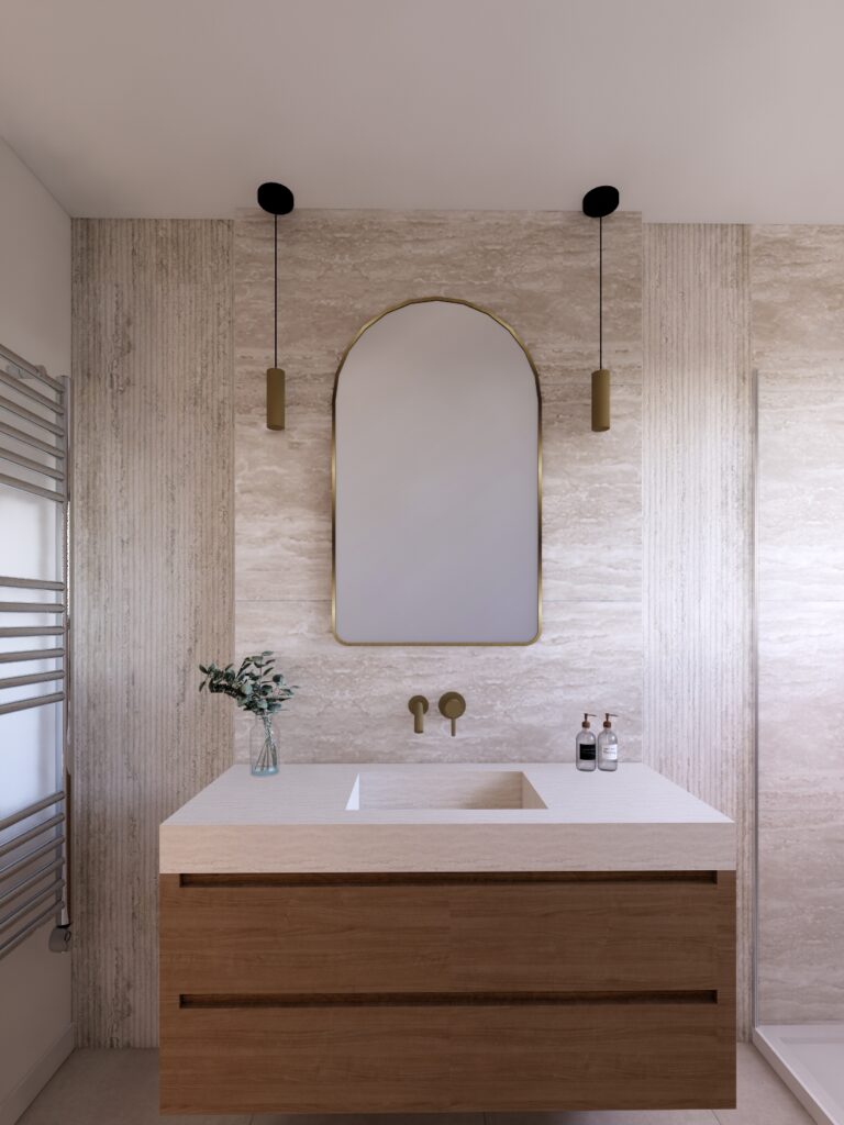 Le choix s’est naturellement porté sur un carrelage effet travertin, apportant texture, luminosité et authenticité à l’ensemble. Cette matière, à la fois douce et minérale, structure l’espace et crée une atmosphère apaisante, parfaitement adaptée à une salle d’eau contemporaine.